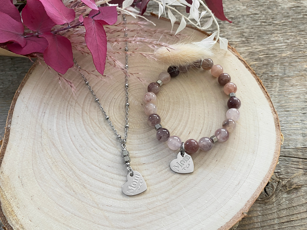 Arborant une jolie breloque avec l’inscription « Mom », le collier et le bracelet de cette édition limitée évoquent l’amour incroyablement puissant d’une mère. Ces créations spéciales sont fabriquées d’acier inoxydable argent, un matériau hypoallergénique et résistant à l’eau. On y retrouve aussi des pierres fines Berry Quartz aux accents de rose mauve, uniques les unes les autres comme chaque maman.