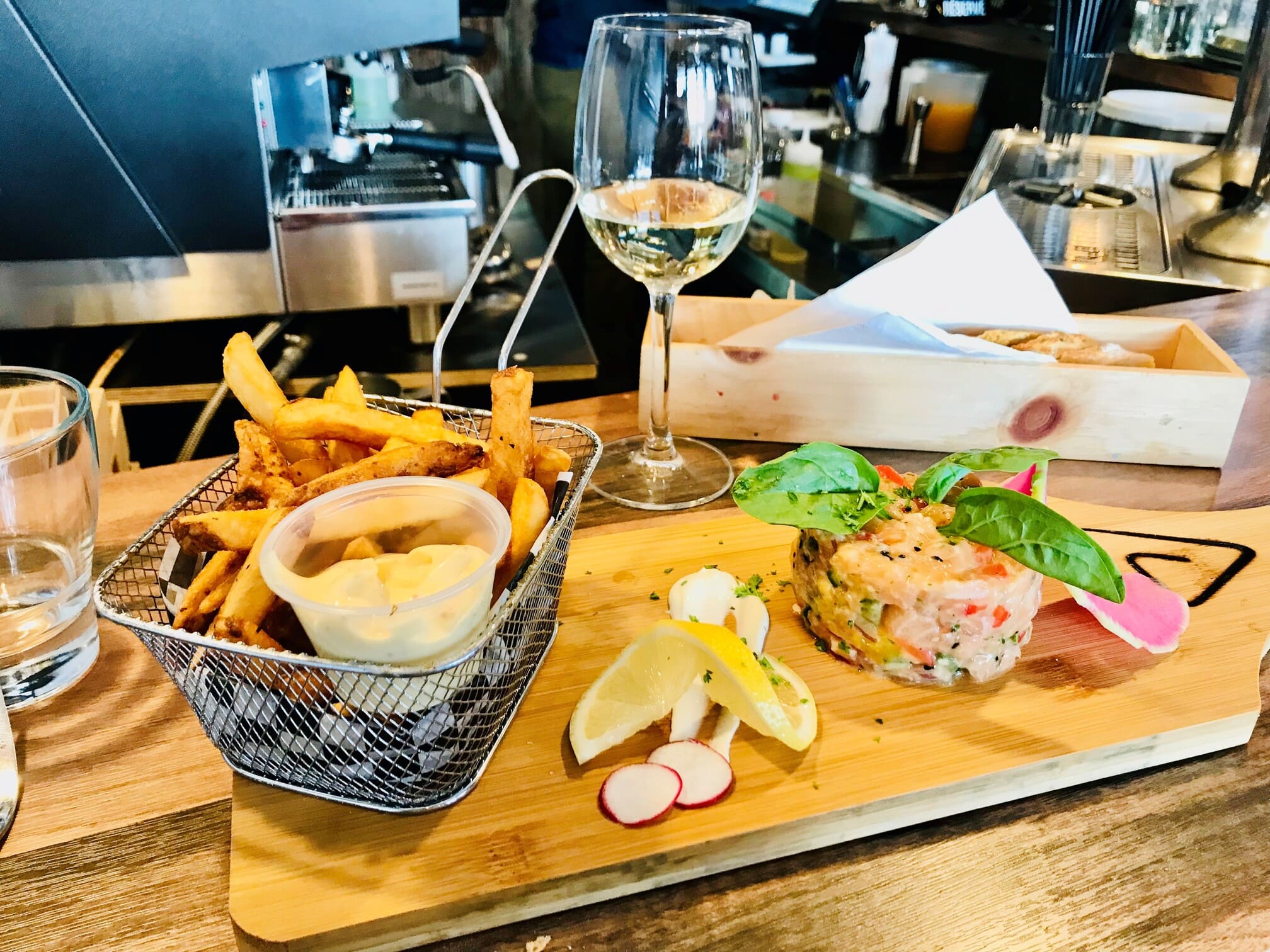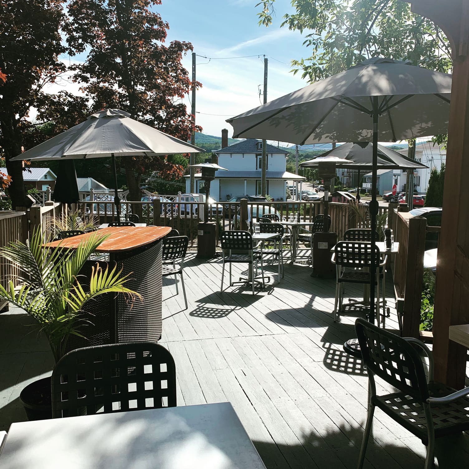 La première terrasse à l’avant avec vue sur la vie de la rue et l’autre à l’arrière à l’ombre de grands arbres et pergolas, ou l’on découvre un endroit bucolique le temps d’un repas ou d’un apéro à l’écart de la folie estivale. Vous pourrez y déguster leurs spécialités de pizzas fines, tartares, carpaccios, moules, tapas en plus de leurs cocktails, mocktails, bières locales et vins d’importation privée. Ils ont le souci de mettre de l’avant les produits régionaux servis par un personnel souriant et avenant!