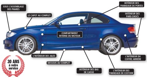 Ses techniciens d’expérience, qui composent la même équipe depuis plus de 30 ans, sauront faire la différence. Tous les types de véhicules peuvent être traités, qu’ils soient à essence, hybrides, ou électriques. Les véhicules sont garantis à vie est transférable si le traitement est appliqué à chaque année, vignette à l’appui. Le traitement s’effectue en 30 minutes. Il est transparent, inodore et surtout NE COULE PAS.