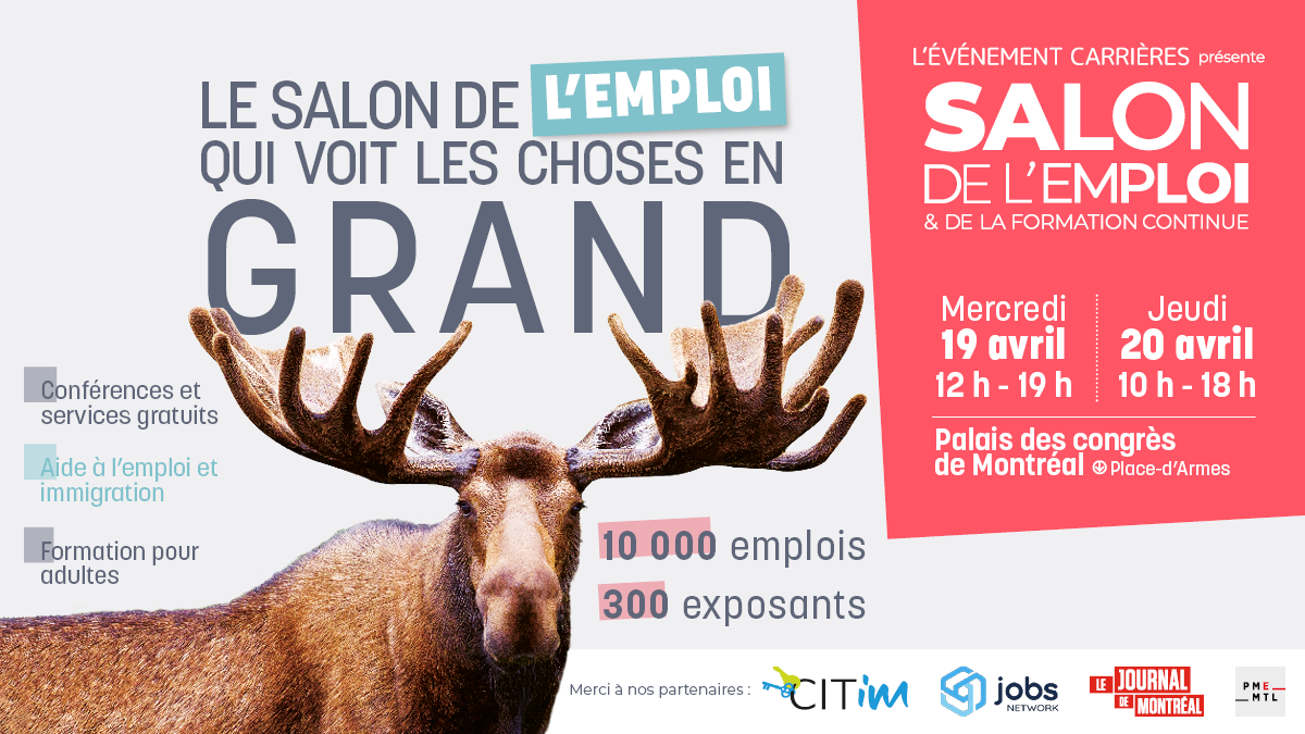 Si le printemps est synonyme de renouveau et de renaissance, se pourrait-il qu’il soit également la première saison du restant de votre carrière? Les mercredi 19 et jeudi 20 avril prochain, retrouvez le Salon de l’emploi et de la formation continue au Palais des congrès de Montréal. Avec 300 exposants et plus de 10 000 offres d’emploi à combler, c’est l’occasion ou jamais de faire des rencontres prometteuses en personne!