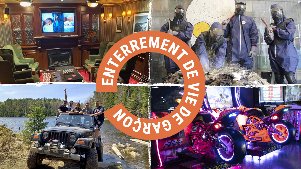 Retrouvez tout ce dont vous rêvez de vivre pour célébrer le futur marié, et ce, sans avoir à vous déplacer : rallye VTT et jeep modifié hors-piste; BBQ hamburgers et bières; championnat de mini-golf, volleyball et lancer de hache; tir à l’arc, souque à la corde et sciage de billot pour mousser l’adrénaline en équipe; partie de pêche sur ponton avec dégustation de whisky; wakeboard et ski nautique agrémentés de hot-dogs européens; jeux et défis en forêt, souper gastronomique, piscine et jacuzzi.