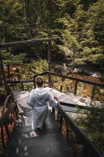 Évadez-vous à l’intérieur de leur crypte vapeur construite sous forme de grotte en pierre; leur banya russe, une exclusivité dans le domaine des spas de la région; en plus de leurs bains californiens, saunas finlandais, cascades nordiques, accès sécurisé à la rivière ainsi que leurs multiples aires de détente avec foyer, le tout dispersé sur les différentes terrasses de leur site en pleine nature.