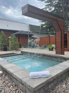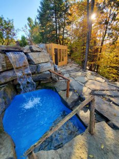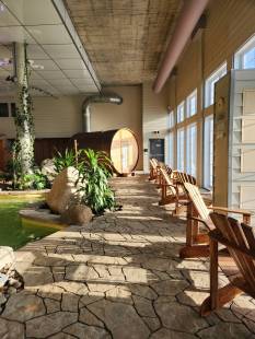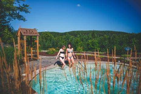 Quatre choix de sauna vous sont proposés : infrarouge, sibérien, sec avec vue sur rivière et le bon vieux sauna en pierres. Hammam, cascade froide, bassin thermal, spa avec cascade sont aussi à votre disposition, en plus d’une superbe terrasse avec vue sur la rivière où vous pouvez déguster un petit lunch au bistro santé (la pizza maison est un incontournable) pourvu d’un permis alcool.