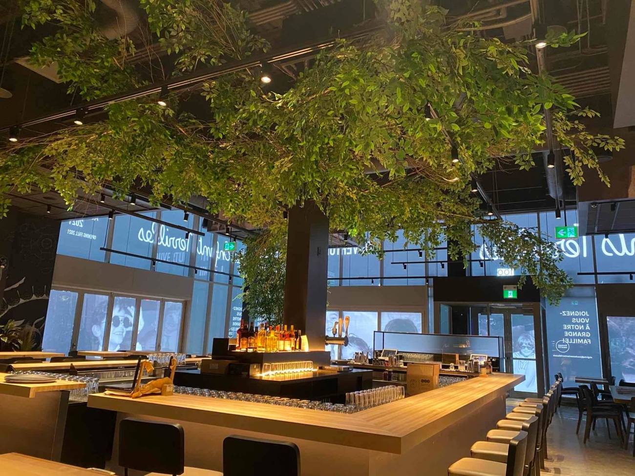 Le temps de commander un Mojito D’Outremont (Havana Club anejo reserva, sirop d’érable, menthe, lime, soda) et un Coco Love (Portage London dry, apéritif Les Îles, lime, Comptonie voyageuse), une visite de l’intérieur s’impose comme une évidence. La devanture, déjà. Impressionnante avec ses immenses baies vitrées qui illuminent la salle à manger, où trône majestueusement un grand bar surplombé d’écrans plats faits sur mesure pour les amateurs de sports.