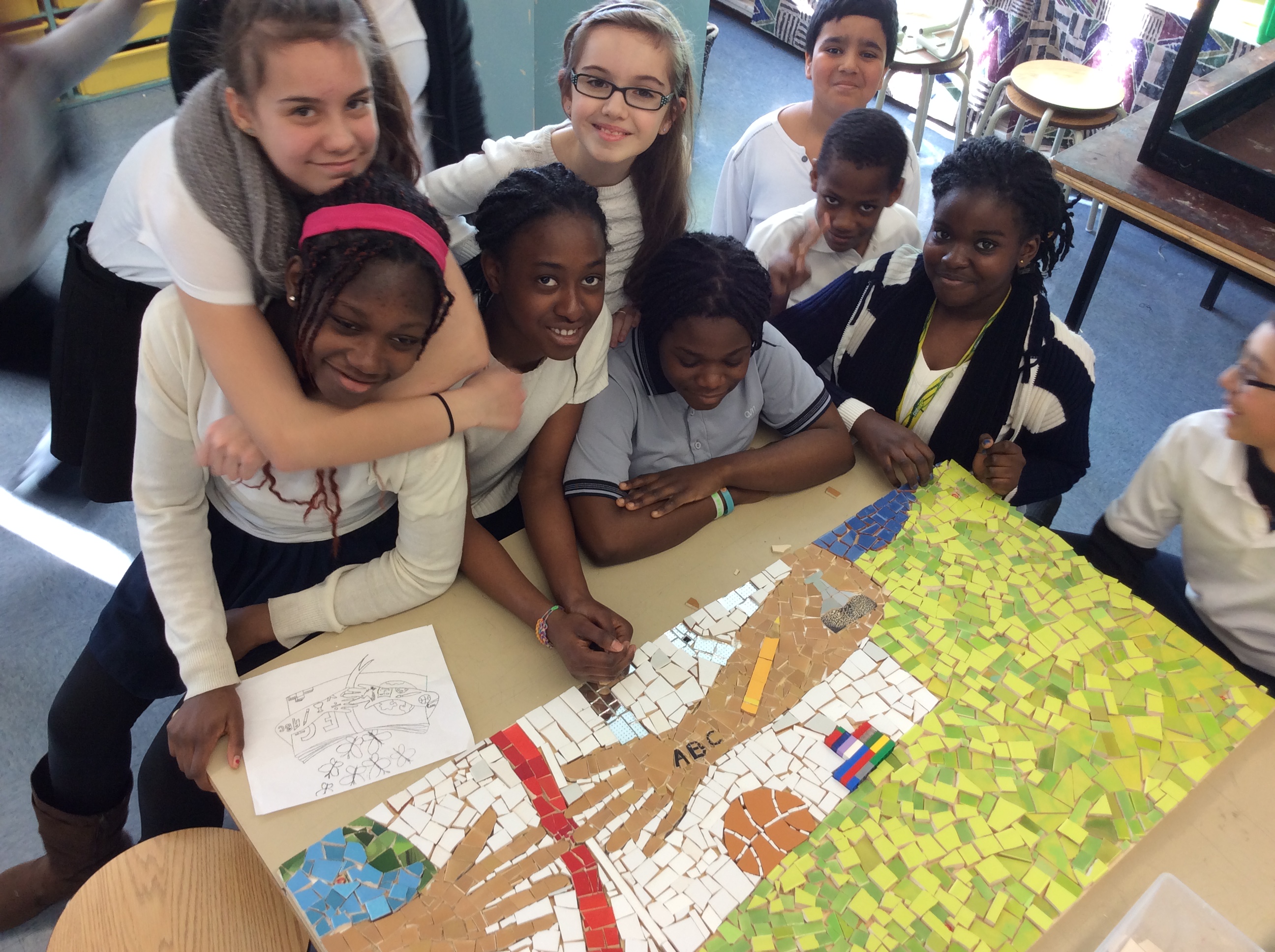 En janvier, à l’école Fernand-Gauthier, tous les élèves, petits et grands, ont participé à un projet de mosaïque avec l’aide d’Adeline Benhammouda. Mme Adeline est une jeune mosaïste pleine de talent. La mosaïque représente les matières et les activités préférées des élèves. On y retrouve, par exemple, des symboles mathématiques, des blocs Lego, un grand livre ouvert, un pinceau pour les arts, un bécher pour les sciences et un ballon de basketball. Nous avons utilisé des tesselles (des morceaux de céramique), de la colle et des pinces pour casser la céramique. Les élèves ont fait preuve de minutie pour placer toutes les pièces de la mosaïque. Quelle belle expérience de coopération ! Aujourd’hui, nous pouvons observer la magnifique mosaïque à l’entrée du gymnase, près du secrétariat. Nous vous invitons à venir l’admirer. Un grand merci à Adeline Benhamouda et aux enseignants de nous avoir fait vivre ce beau projet !