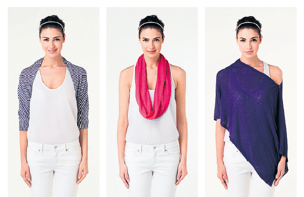 Grâce à un ingénieux jeu de boutons, ce simple foulard en tricot de coton se métamorphose en cape, en poncho, en châle, en boléro ou façon foulard éternité. Une polyvalence qui en fait le compagnon idéal de nos petites robes d’été et de nos hauts sans manches.