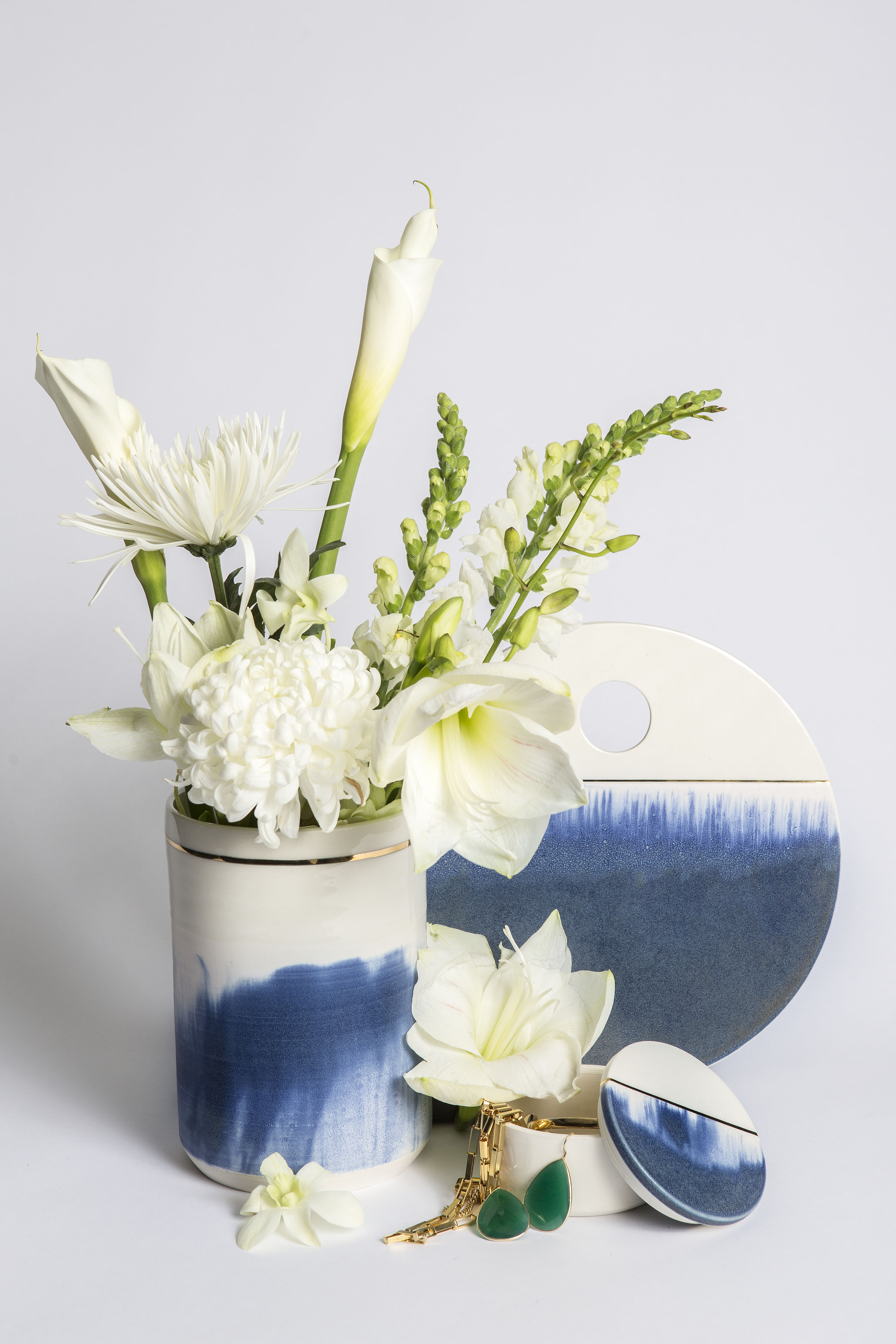 Pour sa part, la céramiste Marjorie Camiré a repris trois pièces phares de sa collection (une main de sel, un plateau de service et un vase), qu’elle a trempées dans un pigment cobalt pour obtenir un effet dégradé tout en simplicité.