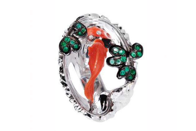 Ses voyages sont une autre source inépuisable d’inspiration. Ainsi, sa bague en hommage au Japon, par exemple, représente un poisson en corail rouge nageant dans un étang en cristal de roche surmonté de feuilles de nénuphar en or noir agrémenté d’émeraudes.