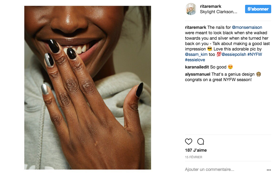 Même les novices peuvent réussir cette manucure, telle qu’aperçue au défilé automne-hiver de Maison Monse. On parle après tout de trois ongles entièrement recouverts d’une couleur foncée au choix (ici, le noir), alors que l’ongle du petit doigt est peint en argent et que seul l’annulaire demande un peu plus de travail. «Pour tracer une ligne verticale bien droite, je tiens fermement le pinceau d’une main et je déplace plutôt l’autre d’un geste rapide», détaille Rita Remark.