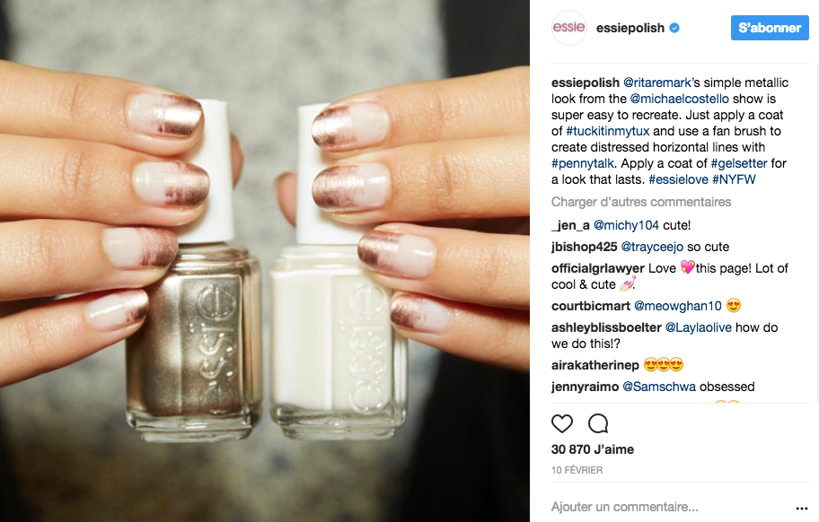 Pour jazzer la manucure à la française classique, il suffit d’utiliser un pinceau en éventail pour superposer une nuance métallique en fine couche un peu brouillonne à un couleur neutre. On peut très bien imiter Rita Remark, qui avait agencé un doré à du rose pâle pour le défilé automne-hiver de la marque Michael Costello. «C’est très facile à faire soi-même parce qu’on n’a pas besoin d’être parfait», ajoute-t-elle.