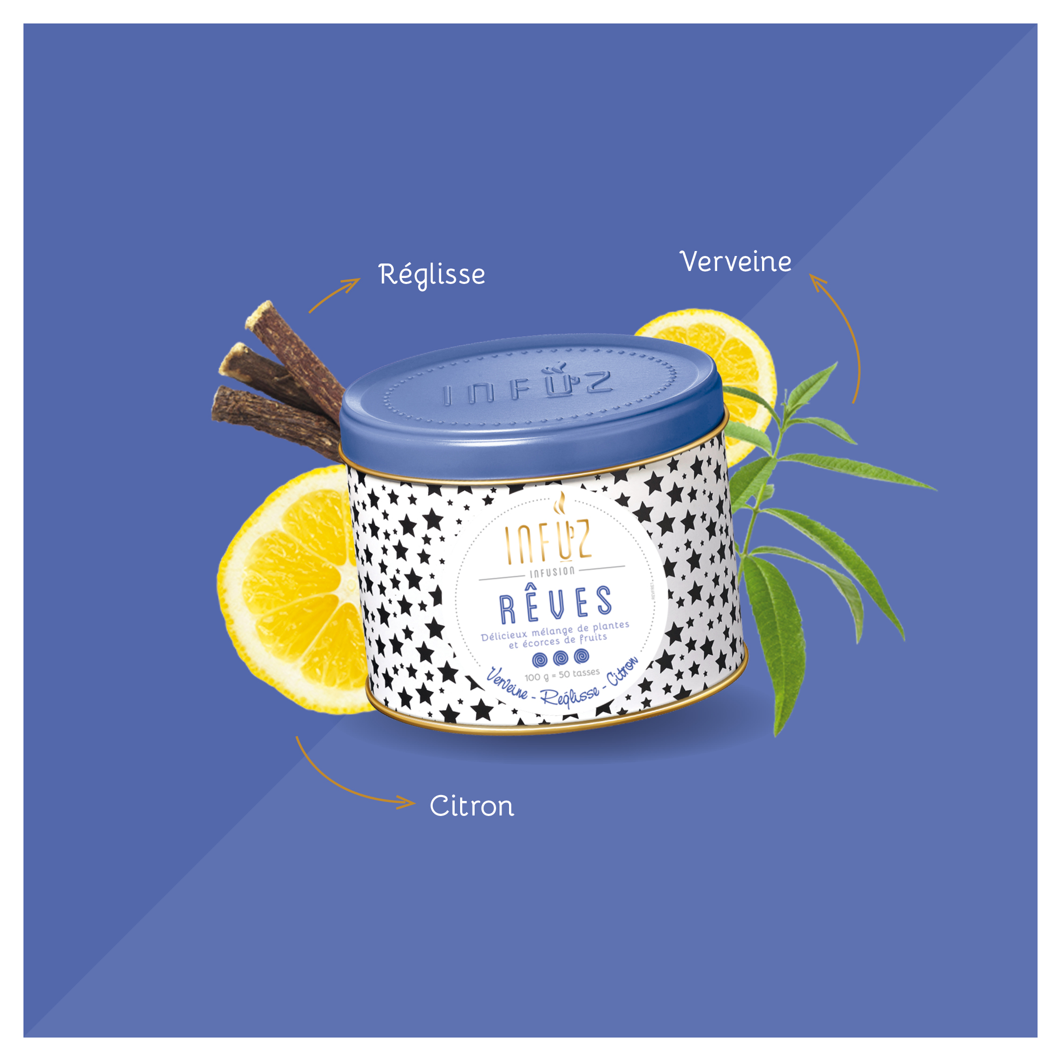 Une tisane relaxante verveine-réglisse-citron qui se déguste après les repas ou à l’heure du coucher et qui est offerte dans un contenant design réutilisable.