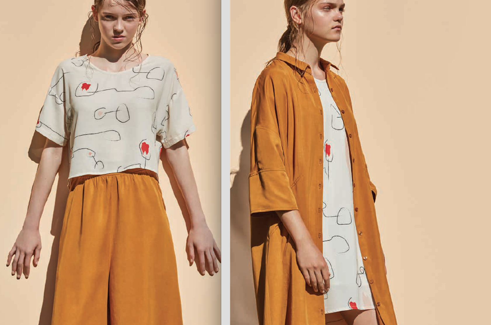 La designer montréalaise a utilisé ce tissu pour confectionner des hauts et des robes, en harmonie avec la palette qui habille le reste de la collection, composée de pièces ocre, blush, bleu ciel, crème et noir.