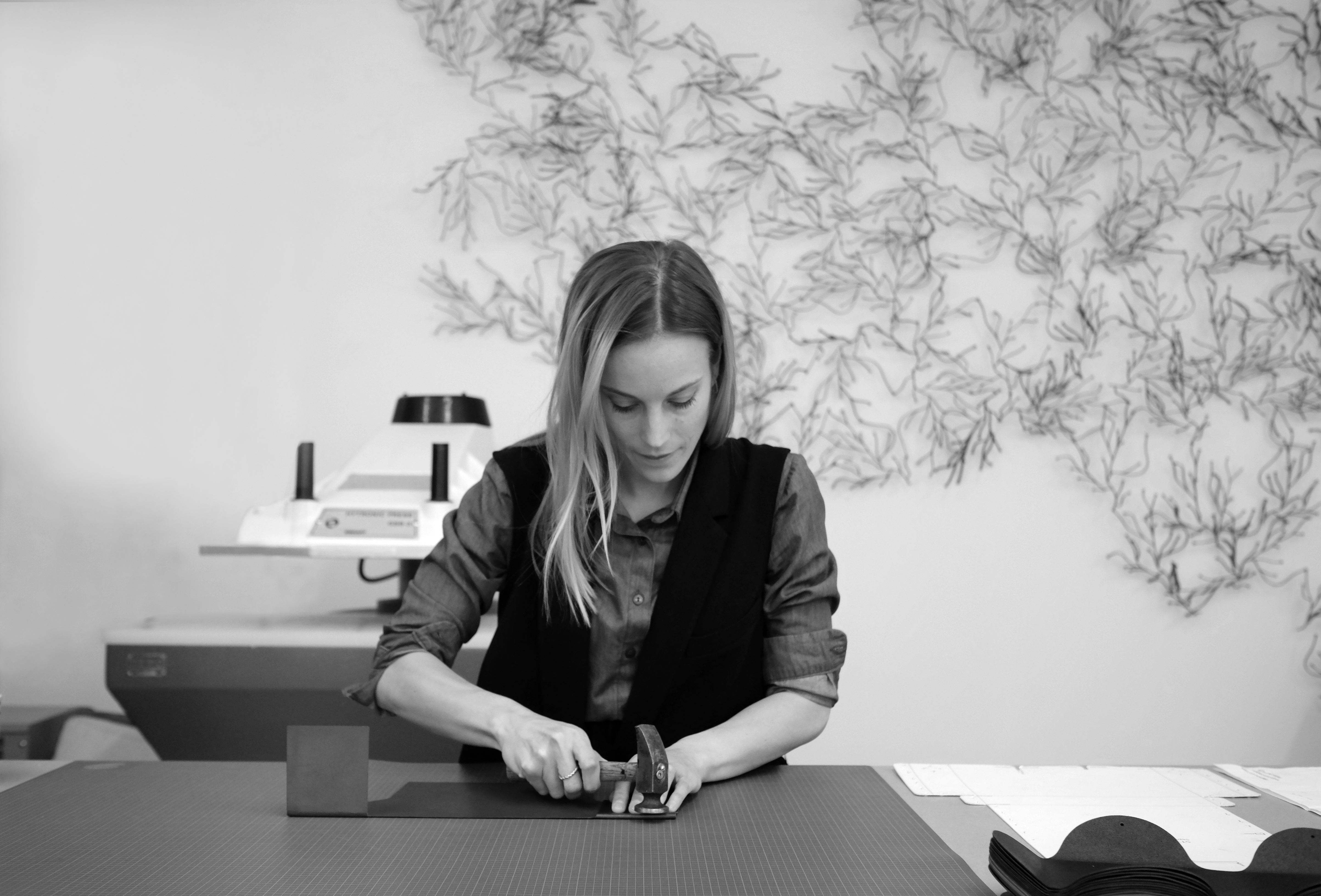 Tout ça tient bien en place grâce à des formes de patrons étudiées, des pliages précis et une quincaillerie unique. Oubliez les gros clous ou les rivets ordinaires! La designer souhaitait une finition plus délicate, carrément inspirée de la joaillerie: «Je traite la quincaillerie comme des bijoux», précise-t-elle.