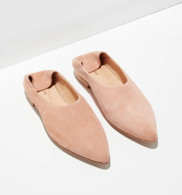 Babouche à bout pointu en suède (nuance Pêche), Frank And Oak, 125$