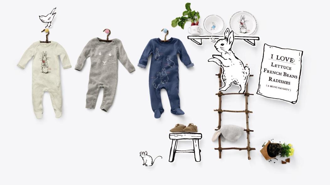 Revisité par BabyGap, The Tale of Peter Rabbit (Pierre Lapin, en version française) propose de mignonnes pièces pour bébés, filles et garçons. Je vous mets au défi de retenir un petit «oh!» attendri à la vue de la collection.