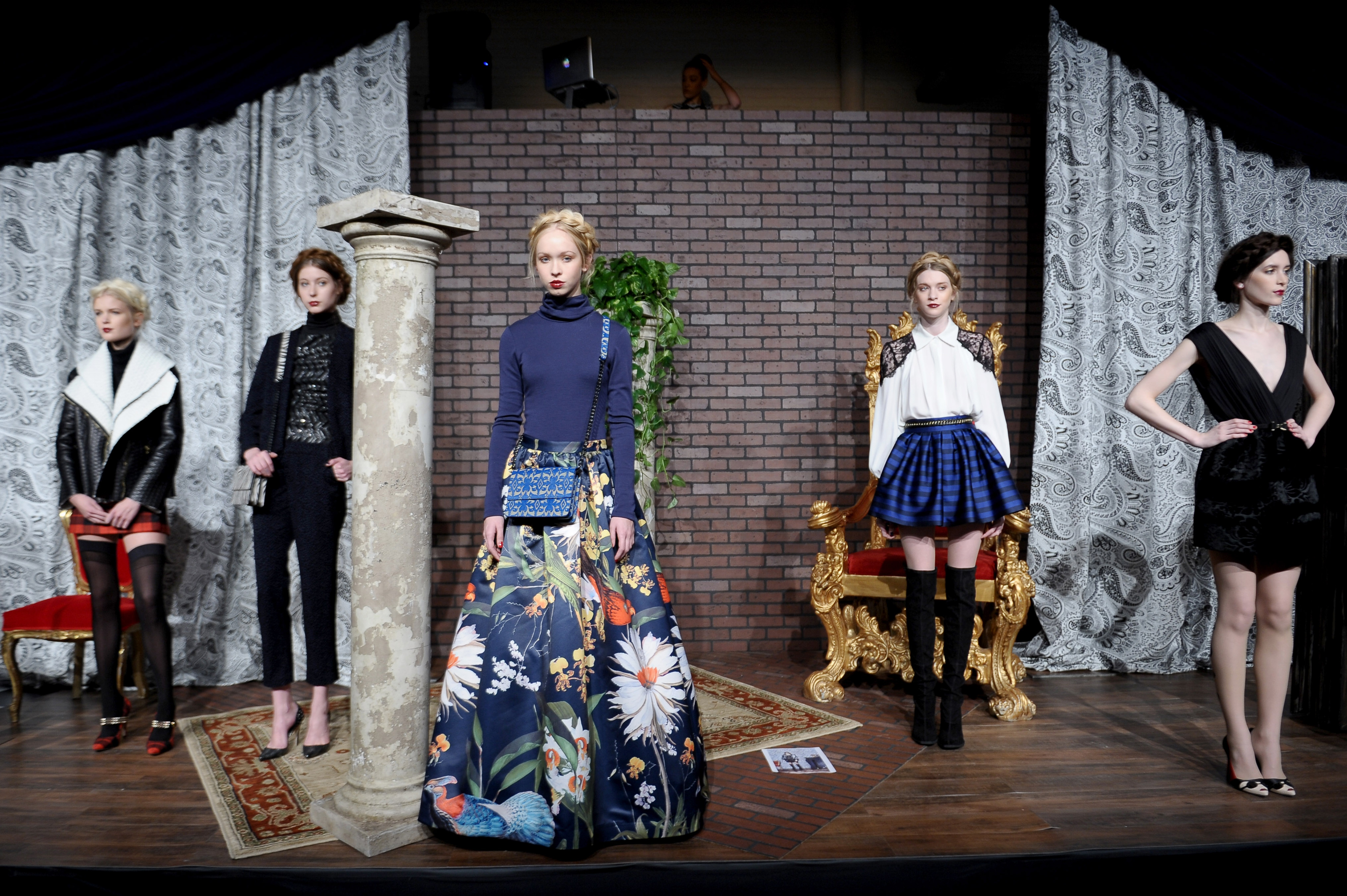 Ensuite arrivent des mannequins sinistres, aux longs ongles laqués de rouge, semblant tout droit tirées d’un film de Tim Burton et vêtues de robes élaborées et de tailleurs-jupes aux références anglaises évidentes (tartan et tweed, silhouettes élisabéthaines et victoriennes). À moins de s’appeler Helena Bonham Carter, ce n’est pas l’endroit pour magasiner une garde-robe… mais n’oublions tout de même pas que Browne est celui qui a créé le manteau que portait Michelle Obama à l’investiture de son mari le mois dernier.