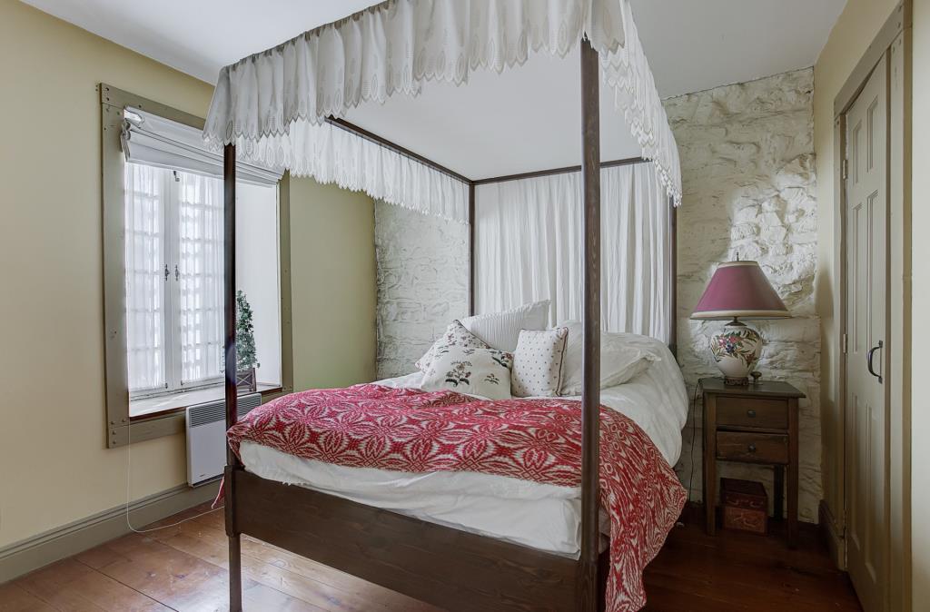 On y trouve aussi un décor qui fait écho au passé des lieux: deux cheminées en pierre, un lit à baldaquin, une baignoire sur pieds, des tapis et des rideaux d’une autre époque meublent la maison. On espère que vous aimez le style, parce que tout ça est inclus dans la vente!