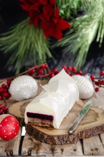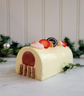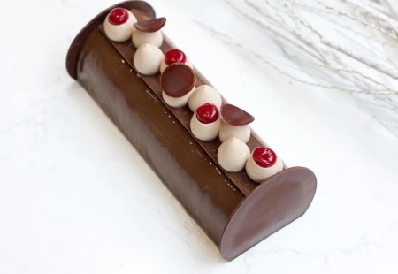 Cette année, on aura le choix entre une bûche rectangulaire au chocolat manjari (un chocolat noir de Madagascar), pacanes, caramel et mascarpone ou une bûche roulée au fruit de la passion, au yogourt, à la fraise et (surprise!) à la rhubarbe.