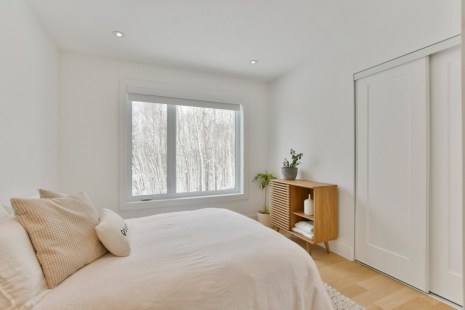 À l’intérieur, son plafond cathédrale, ses couleurs claires, ses luminaires haut de gamme et son foyer au bois ont tout pour charmer. Grâce à leur fenestration généreuse, les 11 pièces de la maison – dont une cuisine moderne, trois chambres et deux salles de bain – sont particulièrement lumineuses et, la maison étant située en pleine nature, elles offrent également une vue sur le boisé alentour.