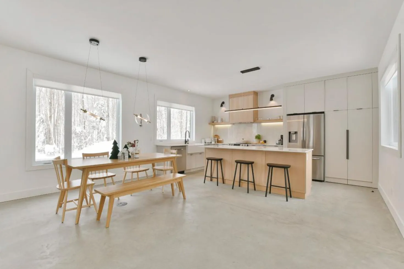 À l’intérieur, son plafond cathédrale, ses couleurs claires, ses luminaires haut de gamme et son foyer au bois ont tout pour charmer. Grâce à leur fenestration généreuse, les 11 pièces de la maison – dont une cuisine moderne, trois chambres et deux salles de bain – sont particulièrement lumineuses et, la maison étant située en pleine nature, elles offrent également une vue sur le boisé alentour.