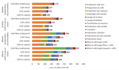 L’électricité utilisée pour laver une tasse de café en Alberta, province où la production d’électricité est basée sur le charbon et le gaz naturel, émet plus de GES (29 grammes d’éq. CO2) que la fabrication d’une capsule de café et son envoi à l’enfouissement (27 grammes d’éq. CO2). Au Québec, grâce à l’hydroélectricité, laver sa tasse au lave-vaisselle a un impact négligeable (0,7 gramme d’éq. CO2 par tasse).