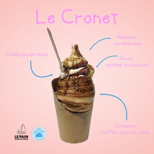 En partenariat avec la boulangerie Le pain dans les Voiles, la crémerie, qui a ouvert sa première succursale sur la rue Chabot en 2010, a créé le «cronet». De quessé? C’est une crème glacée molle parsemée de sauce chocolat ou caramel, et d’amandes caramélisées, le tout, enrobé dans un croissant. Miam!