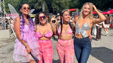 Si les paillettes sur le visage et dans les cheveux sont toujours populaires en festival, elles s’invitent aussi sur des vêtements qui ont su capter notre regard. Une festivalière a confié à Métro que son inspiration était carrément la boule disco! Certaines personnes ont aussi choisi d’exprimer leurs couleurs avec des vêtements à filets transparents et scintillants, portés avec maillot de bain ou sous-vêtements en dessous.