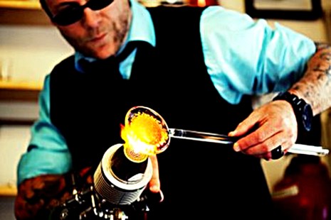 Déjà, l’idée de porter des parures aussi solides que les bols en pyrex séduit. Mais quand le souffleur de verre se met à énumérer les possibilités du matériau (comme la sublimation de métaux précieux, qu’il devient alors possible d’intégrer aux pièces qu’il crée sans risquer l’explosion), on devient carrément curieux.
