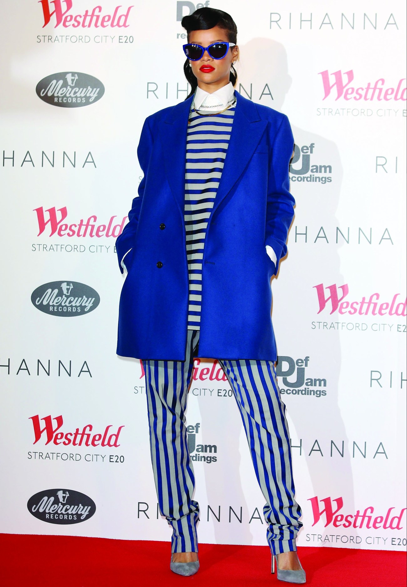 Rihanna est une avant-gardiste et porte la mode à un autre niveau. En 2012, elle choisit un look masculin avec une veste surdimensionnée et une superposition de rayures horizontales et verticales.