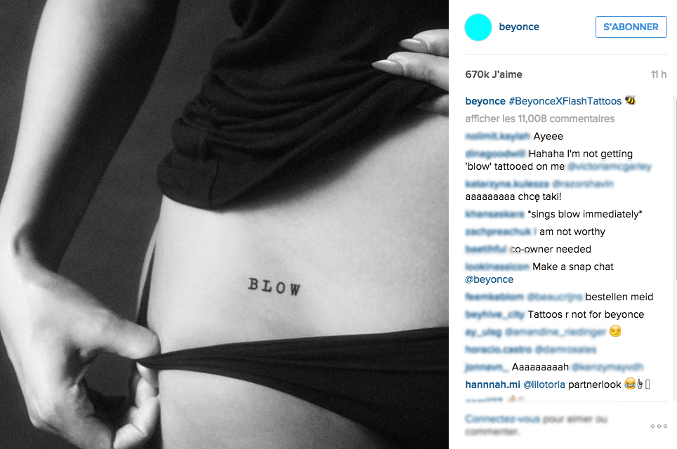 Pour annoncer cette nouvelle à ses fans, Queen B. a posté sur son compte instagram la photo d’un corps (que l’on suppose être le sien) tatoué du mot «BLOW».