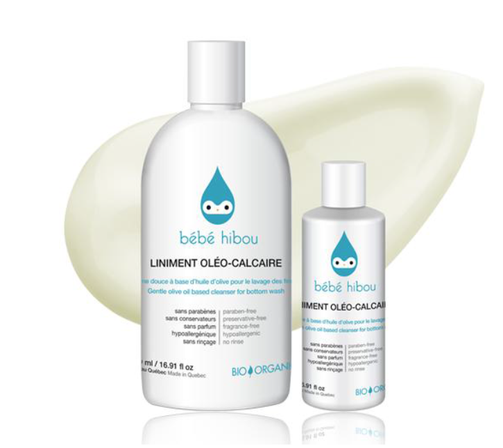 Sans aller jusqu’à parler de produit miracle, je m’explique mal pourquoi le liniment oléo-calcaire est encore si peu connu ici. Il y a certainement une niche à exploiter! Deux jeunes parents d’ici ayant visiblement la bosse des affaires l’ont compris et ont récemment commercialisé leur propre solution. La marque Bébé hibou, dont j’ai testé le nettoyant pour les besoins de ce billet, utilise de l’huile d’olive bio pour son effet émollient, adoucissant et protecteur.