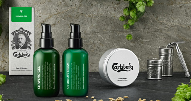 La brasserie Carlsberg offre une gamme de produits à la bière pour hommes qui va du shampooing au baume après-rasage jusqu’à la pommade pour moustache.