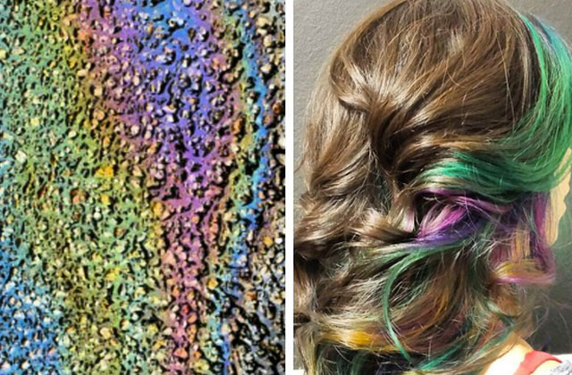 C’est sur les lèvres et dans les cheveux que des fashionistas s’appliquent un mélange de mauve, de bleu indigo, de vert émeraude, de vibrant fuchsia et de jaune ocre. Sur Instagram, on peut trouver plusieurs de ces essais beauté sous le mot-clic #OilSlick.