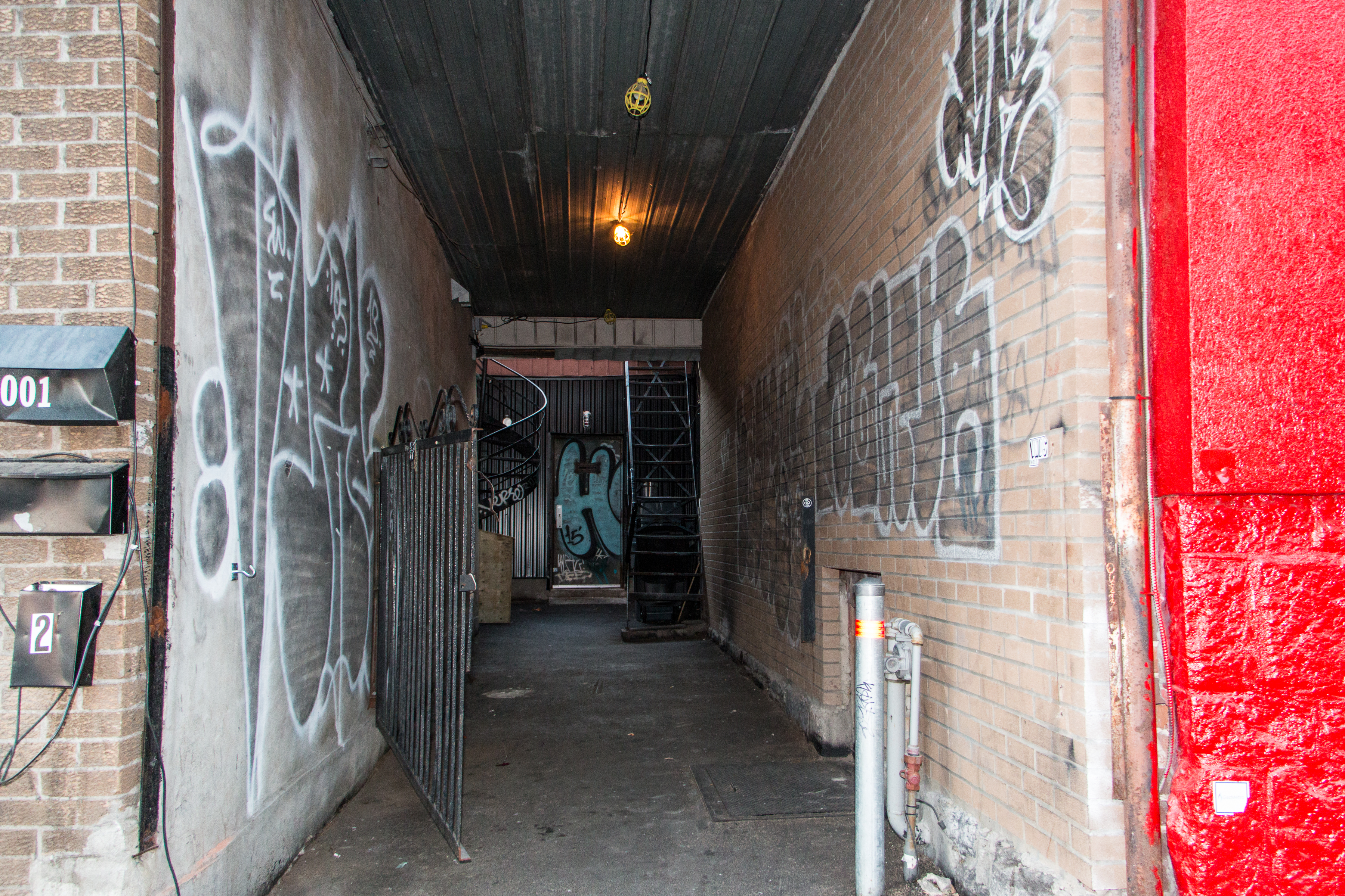 La serveuse du Foiegwa nous invite, à la fin de notre repas, à aller dans la ruelle à l’arrière du resto, où, derrière une porte à l’aspect louche ornée de graffitis, se cache le bar «secret» affilié au resto, le Atwater Cocktail Club.