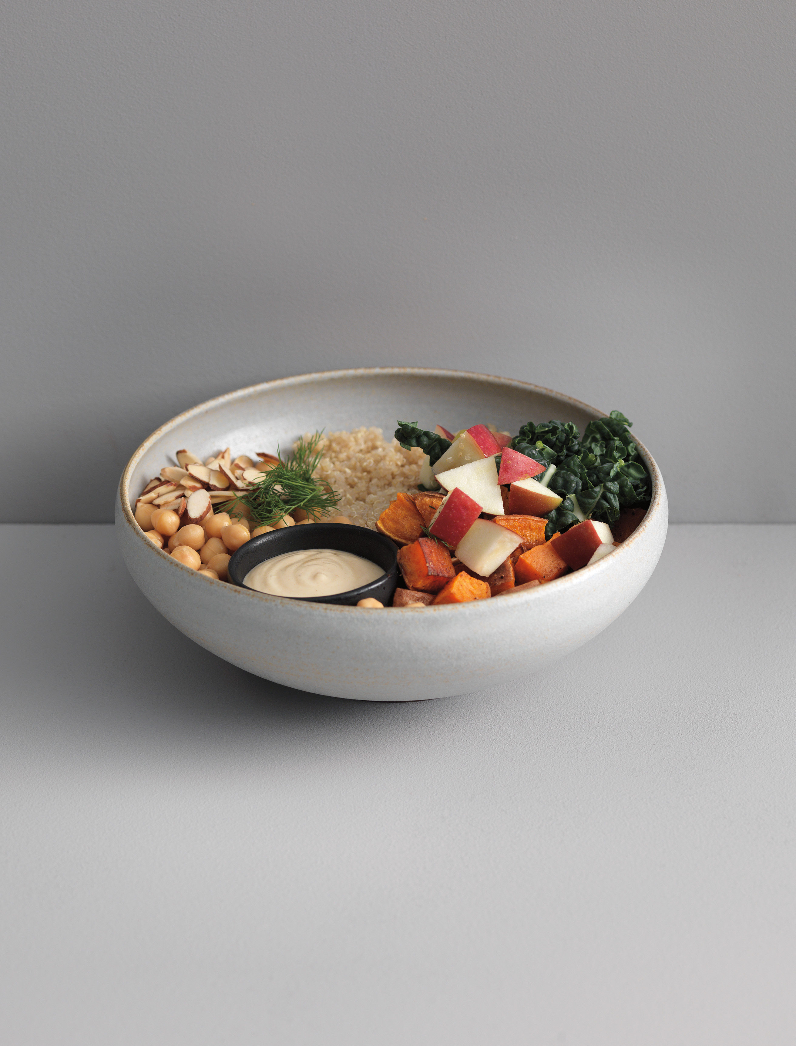 Couvrez le fond de 4 grands bols de quinoa et disposez le chou frisé, la pomme, la patate douce et les pois chiches. Garnissez d’amandes et d’aneth.