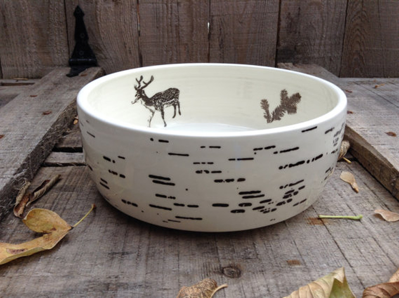 sérigraphie imitation écorce de bouleau à l’extérieur avec chevreuils et branches d’épinettes à l’intérieur