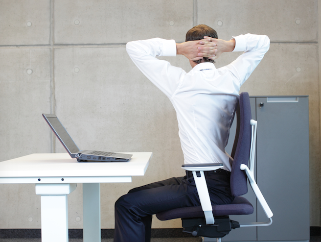 Outre les pauses préconisées toutes les heures pour éviter la position assise prolongée, on peut stimuler la circulation sanguine dans les jambes en restant à son poste. En inspirant, on lève la jambe droite parallèle au sol puis on ramène les orteils vers soi, ponités vers le plafond. Le but est de garder la position pendant 10 respirations puis on change de jambe. Cet exercice est idéal en prévention ou en cas de lourdeur et fatigue ressenties dans les membres inférieurs.