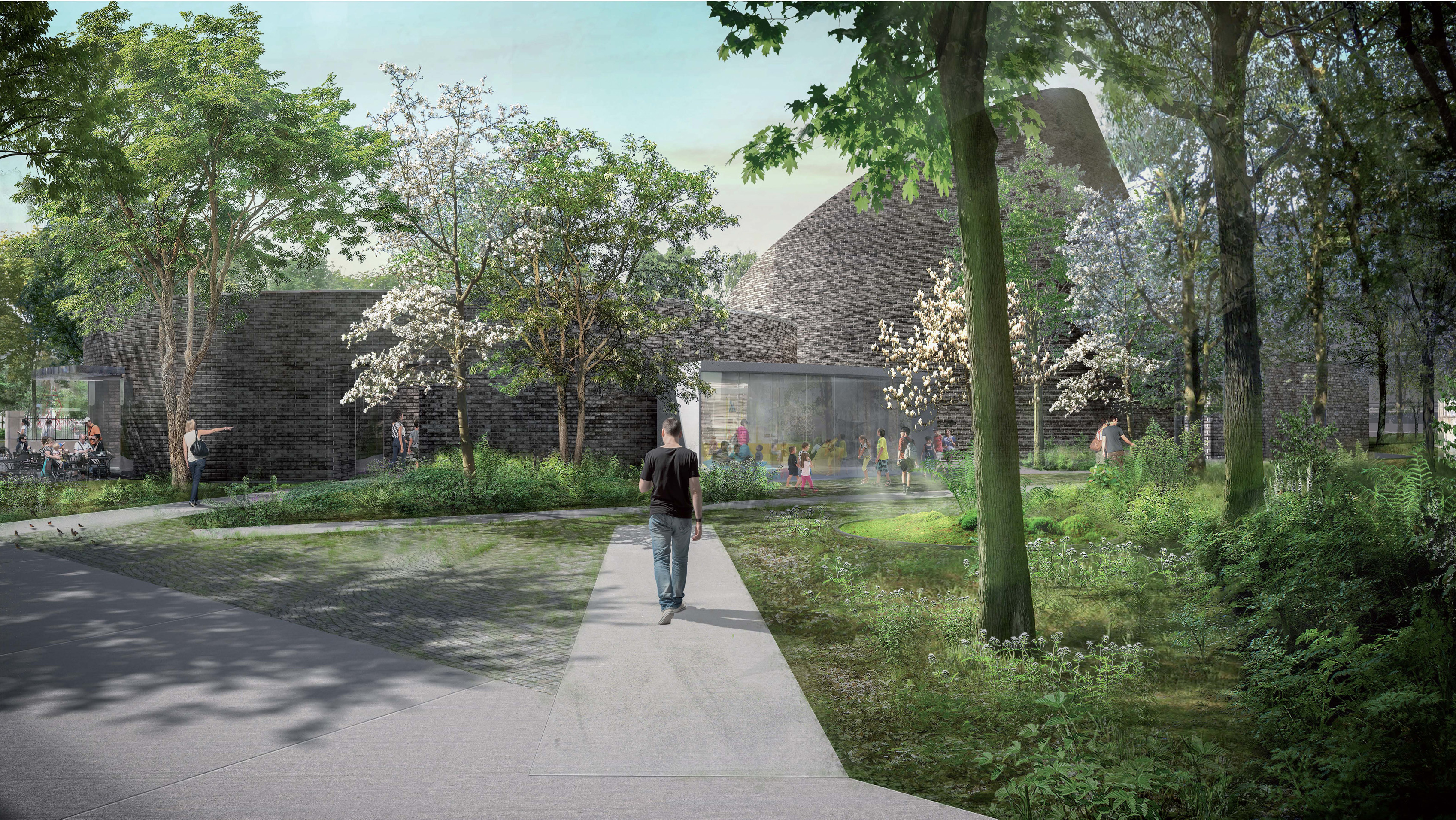 Cela dit, la comparaison avec notre planétarium s’arrête là. Plutôt que d’être plongé dans un environnement aussi minéralisé et austère que celui de notre parc olympique, le planétarium de Strasbourg sera implanté dans un grand jardin verdoyant. Au lieu de miser sur l’aluminium pour l’enveloppe extérieure, de la brique grise, rappelant une texture de pierre, a été privilégiée pour venir s’agencer avec la maçonnerie des bâtiments voisins.