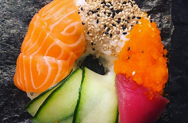 Décorez de garnitures à sushi (poisson cru, légumes, caviar, sésame) et dégustez!
