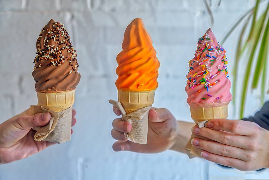 Un incontournable: la crème glacée molle trempée dans du chocolat blanc aux fraises et recouverte de bonbons de couleur. Retour en enfance garanti!