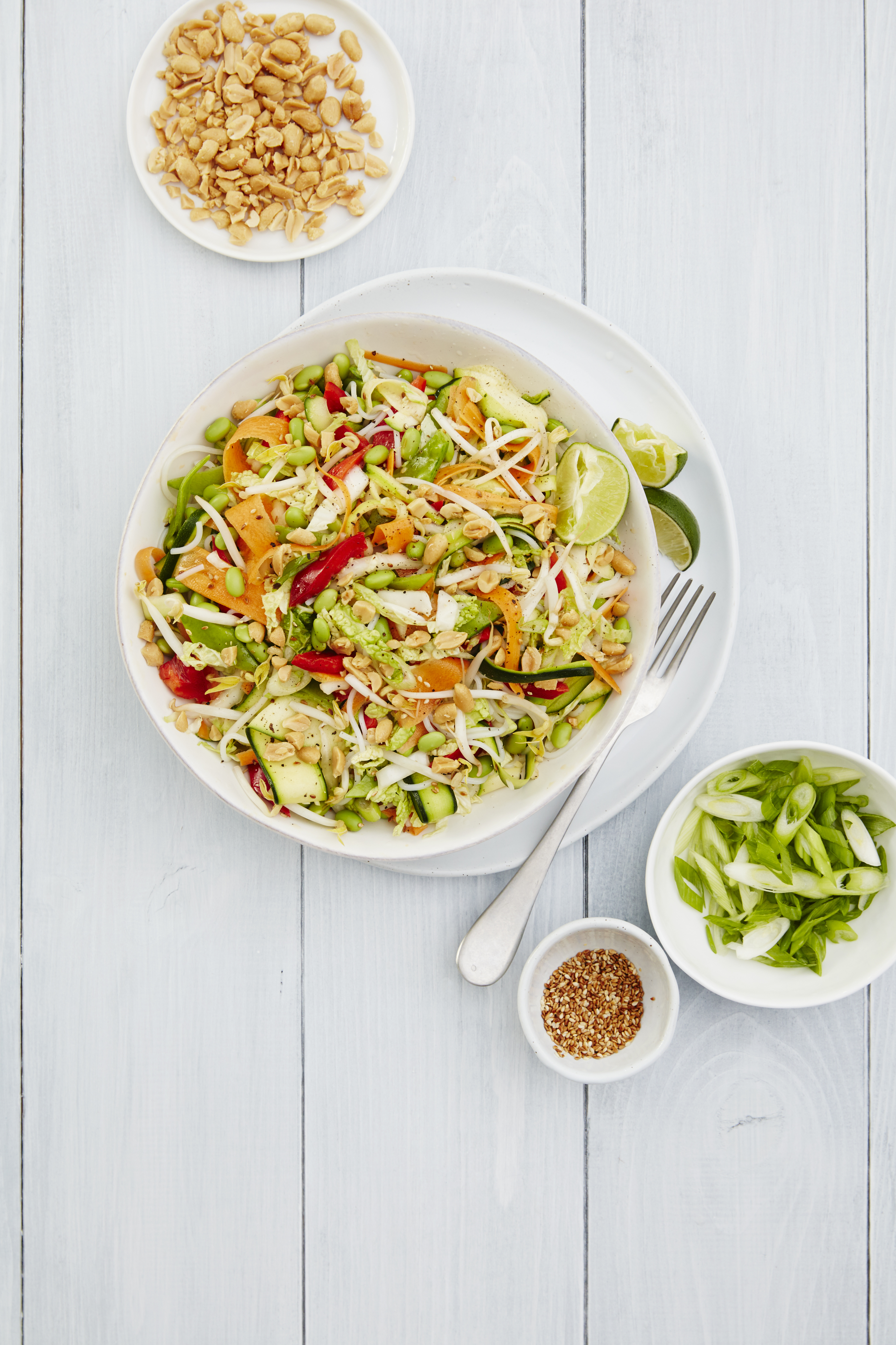 Ajouter les légumes, les vermicelles et les edamames. Bien mélanger pour enrober de vinaigrette. Poivrer généreusement et ajouter une pincée de sel.