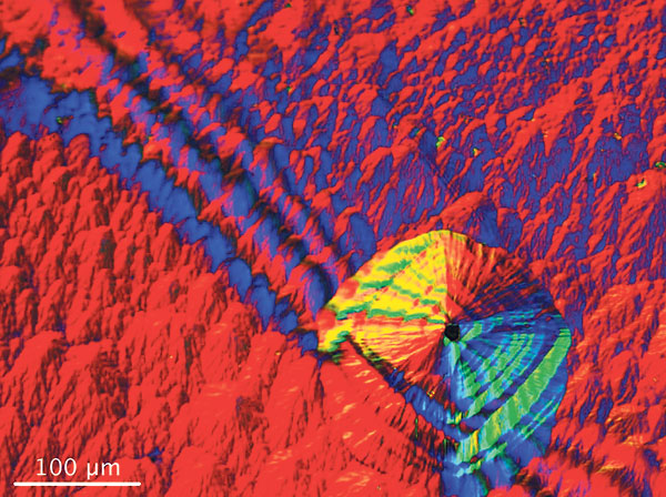 Nous sommes à la surface d’un diamant «né» en laboratoire, constitué de carbone, comme sa version naturelle. Il a ici été bombardé d’atomes d’azote afin de créer avec une précision inégalée des imperfections… En fait, ce bombardement « ait sauter» des atomes de carbone, créant des trous près desquels l’azote vient se loger. Ce phénomène génère des «centres colorés» émettant de la lumière dans le spectre du visible. L’informatique quantique, entre autres, bénéficie de ces travaux.