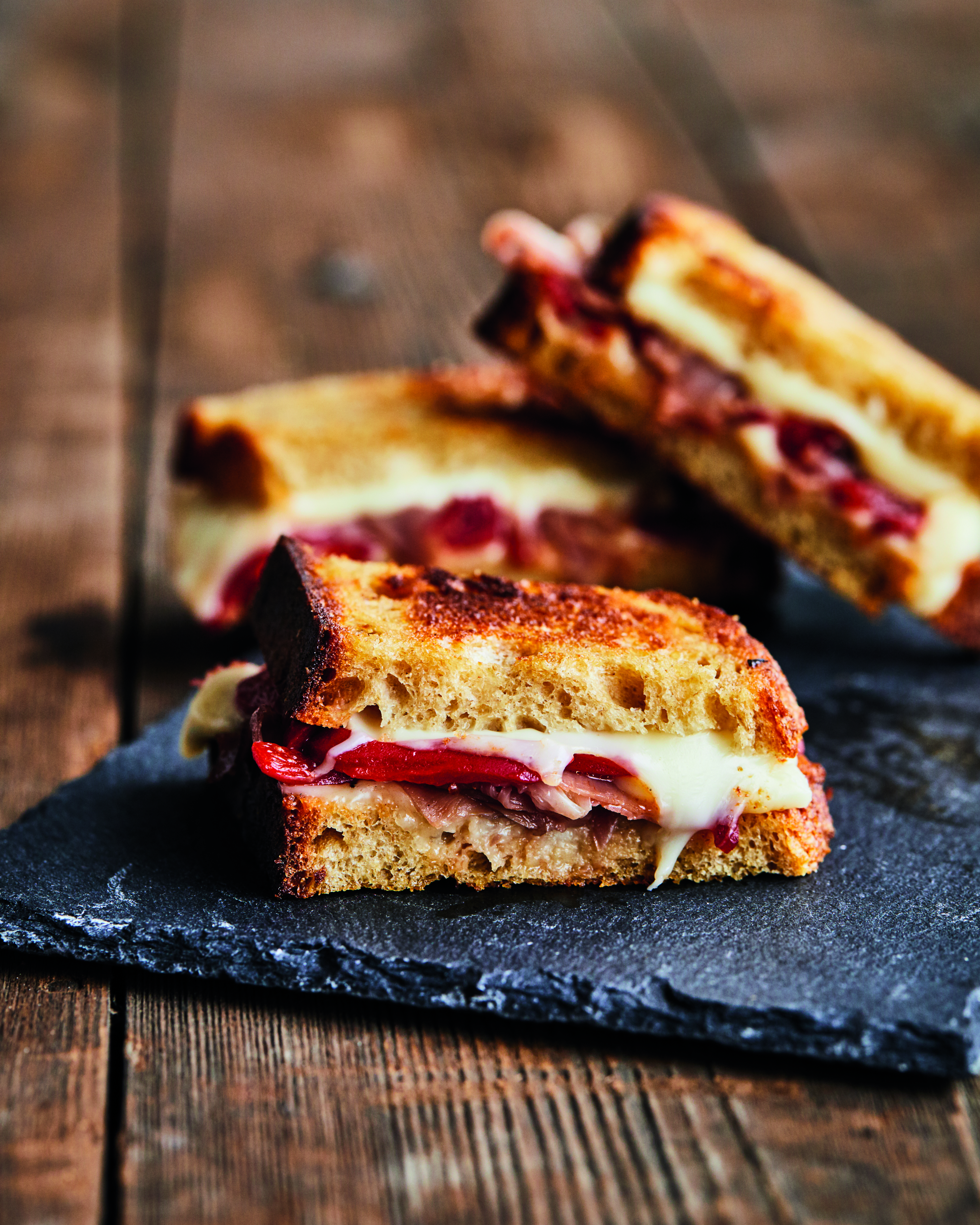 2. Répartir la moitié du fromage sur deux tranches de pain. Ajouter les poivrons, le prosciutto et le reste du fromage. Refermer en sandwich avec les deux autres tranches de pain.