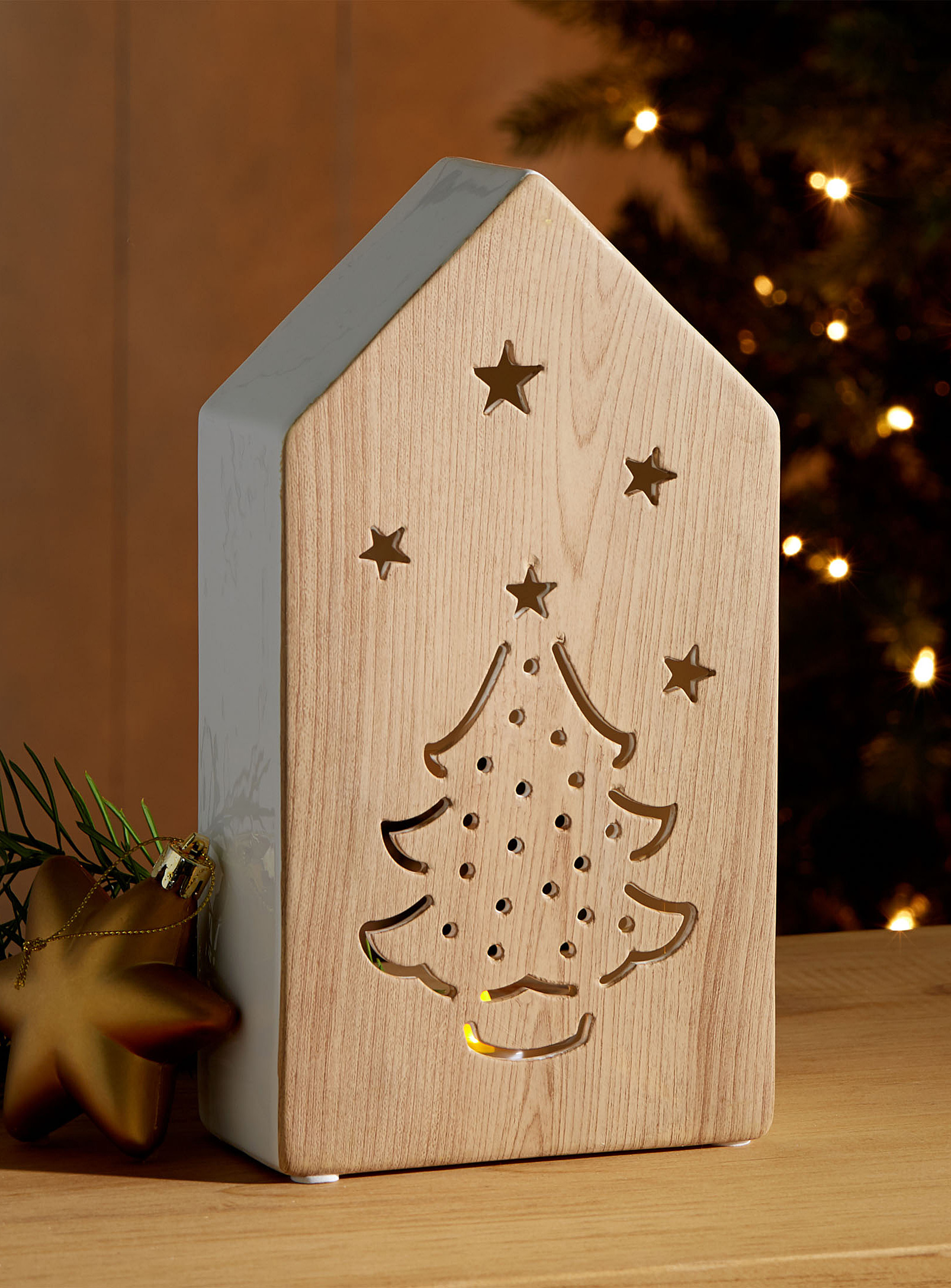 Il suffit de glisser un lampion dans cette maisonnette en céramique pour illuminer le sapin et les étoiles. Lanterne arbre illuminé, Simons, 32$