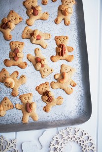 7. Reformer une boule avec les retailles de pâte, abaisser de nouveau et tailler d’autres oursons. Répéter l’opération pour obtenir 36 biscuits. Le nombre peut varier selon la taille de l’emporte-pièce.
