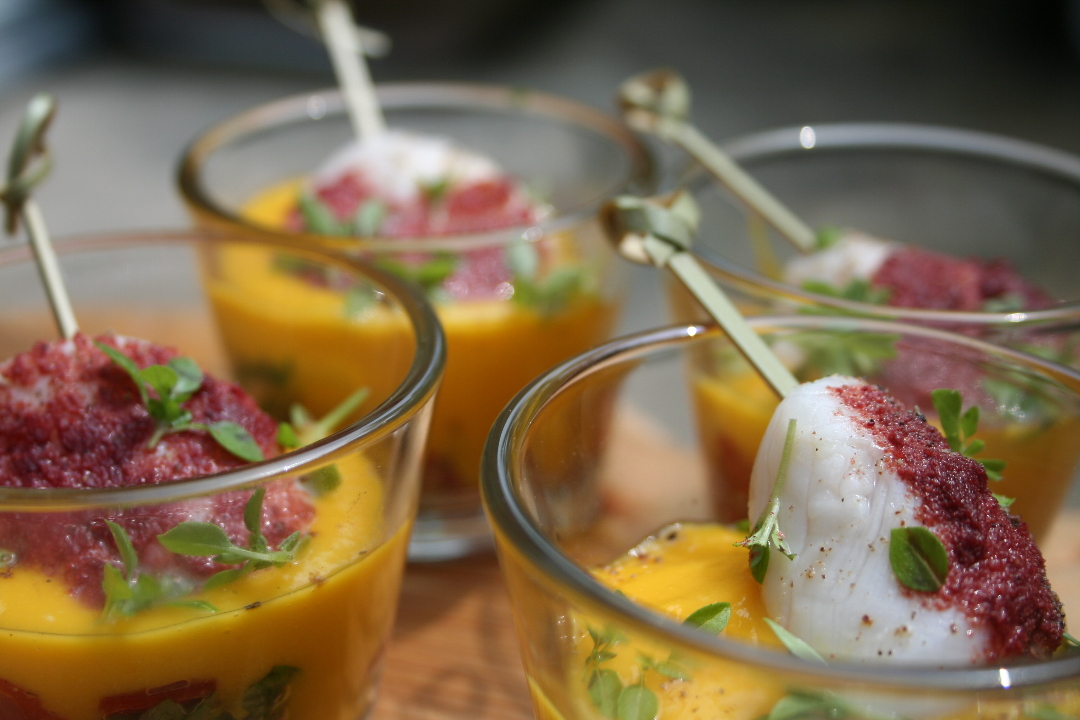 - Pour le montage final, mettre le concassé de tomates dans le fond du verre, puis ajouter un peu de purée de mangue. Retirer les pétoncles du jus de lime et les passer dans la poudre de canneberge.