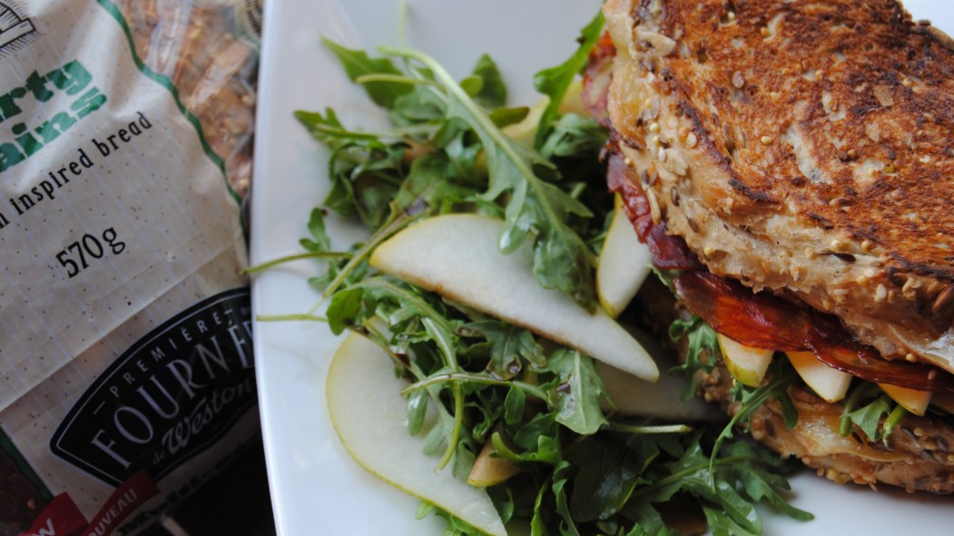 - Lorsque les grilled-cheese sont bien rôtis: étendre les 4 sandwiches avec le fromage Comtomme et mettre les chorizos rôtis, les poires tranchées ainsi que la roquette, bien saler et poivrer.