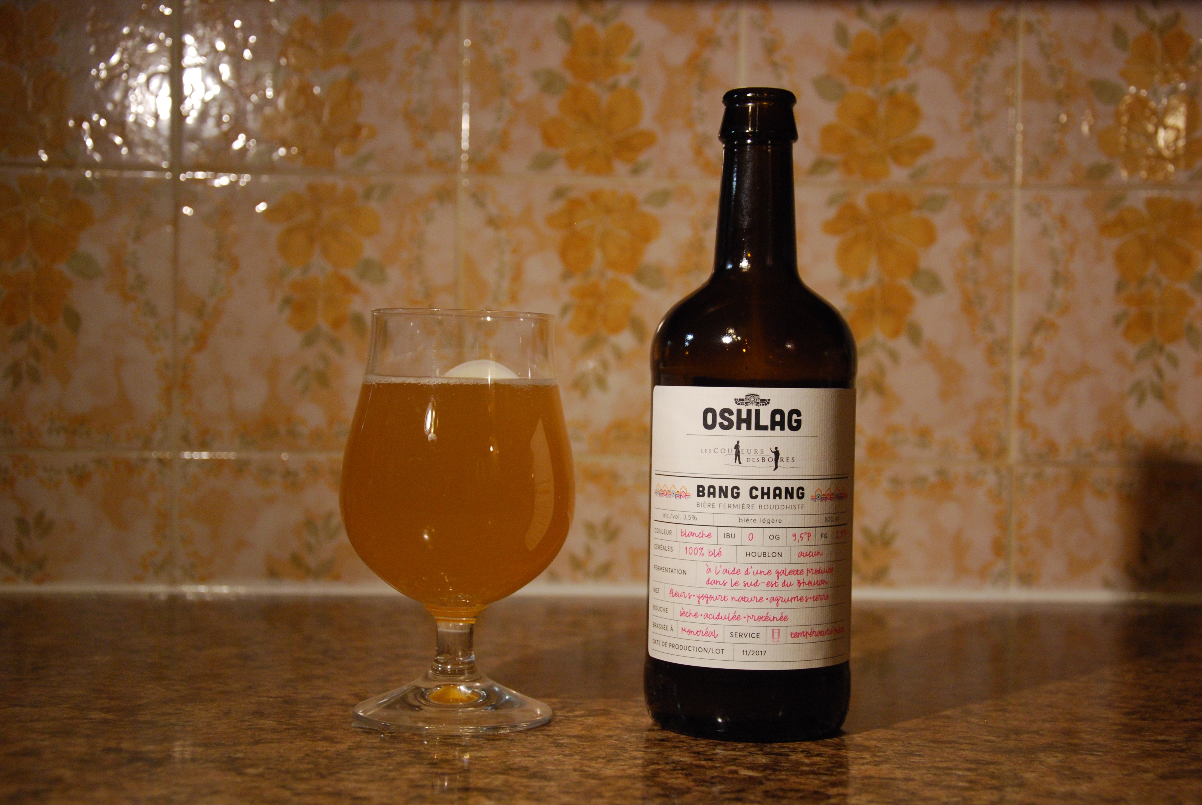 Le coureur des boires Martin Thibault et la brasserie Oshlag ont fait équipe pour nous faire découvrir la Bang Chang, une bière fermière de blé du Bhoutan. Bien différente de nos bières modernes, celle-ci ressemble davantage à un jus de blé légèrement sur. C’est léger et rafraîchissant tout en ayant un bon corps de céréale. Traditionnellement, la Bang Chang est fermentée à l’aide d’une galette de blé contenant des moisissures qu’on dépose directement sur le blé cuit. On y ajoute ensuite de l’eau. La version d’Oshlag utilise une méthode plus moderne, avec un moût. Par contre, M. Thibault a ramené une galette du Bhoutan pour donner à la Bang Chang son goût distinctif. Pour l’expérience totale, il est important d’enlever le gaz de la bière et de la servir à température pièce pour que ça ressemble à «une tisane de blé».