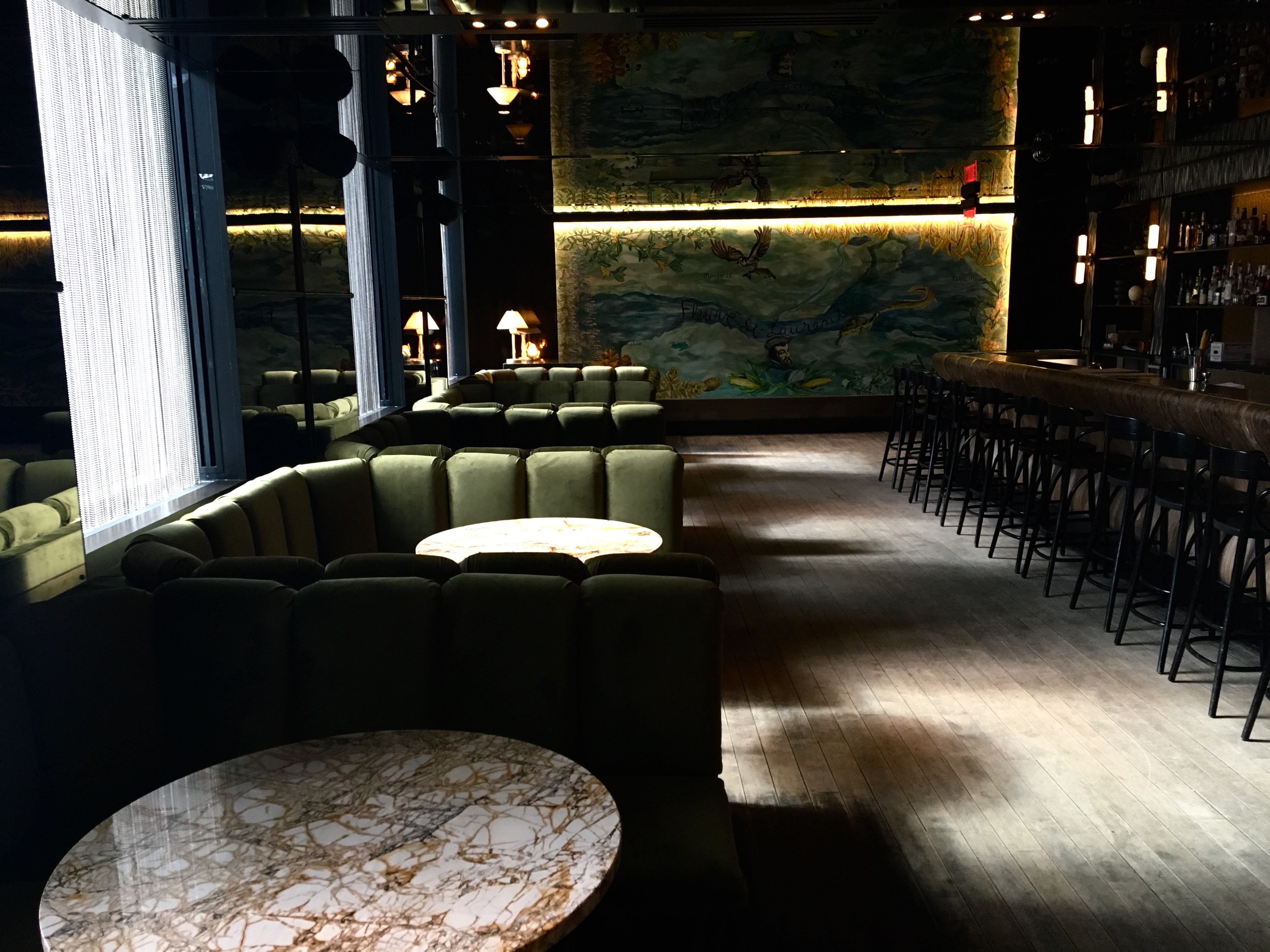 Signé May Redding, le décor feutré inspiré de l’ambiance des bars des années 1940 – en particulier les banquettes recouvertes de velours vert – transforme l’espace qui abritait auparavant le Wunderbar.