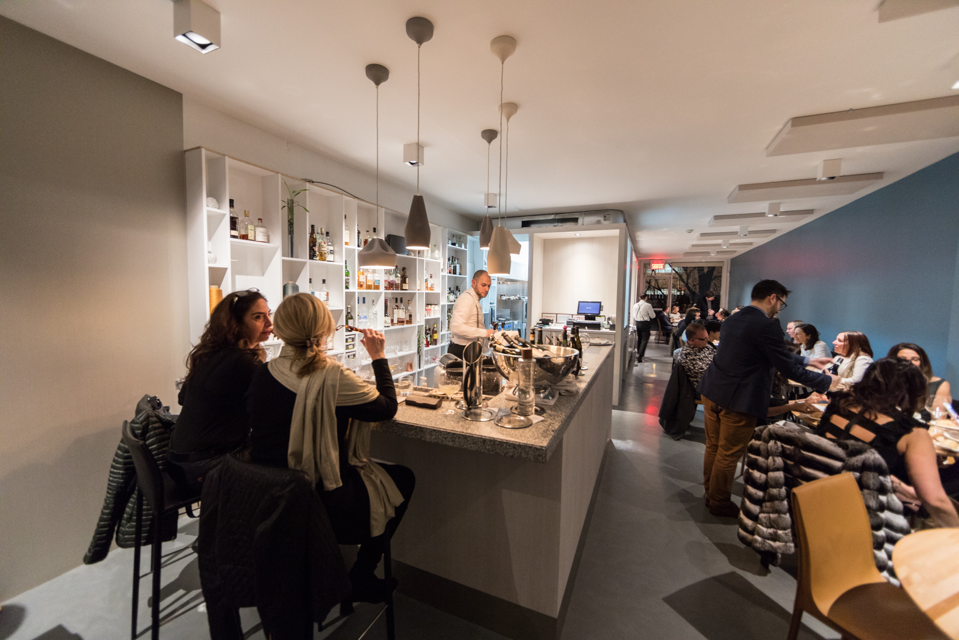 Parmi les autres éléments architecturaux qui donne de la profondeur au nouveau décor, notons le bar en granit blanc dépoli, la mosaïque en grès gris, les grands miroirs et un mur d’un bleu gris apaisant, clin d’œil à la couleur des paquets de sucre en Italie, un des pays qui, avec la France, bien sûr, inspire particulièrement la chef.